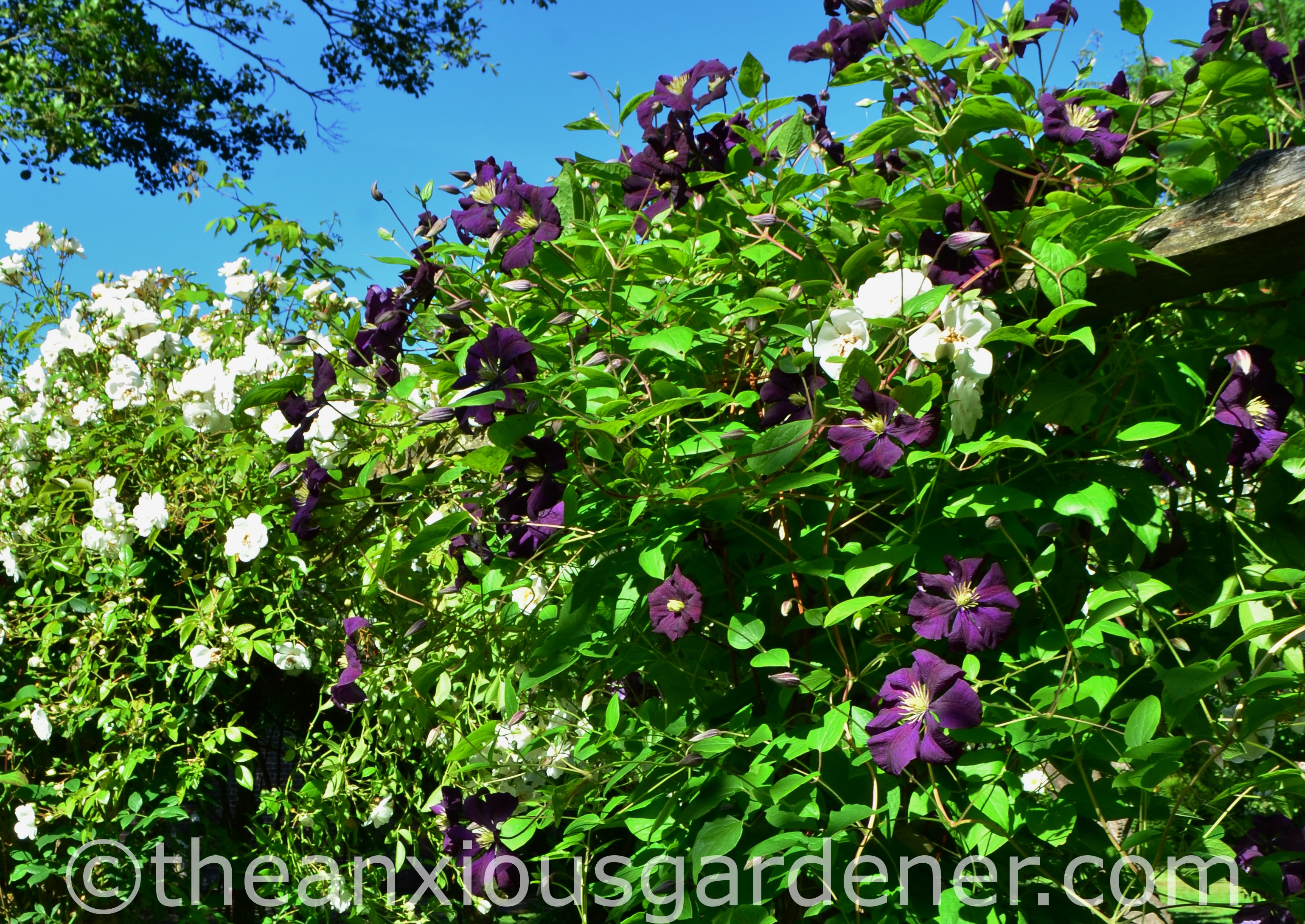 The large flat plates of Clematis ‘Warszawska Nike’ is one of fifteen varieties of clematis here.