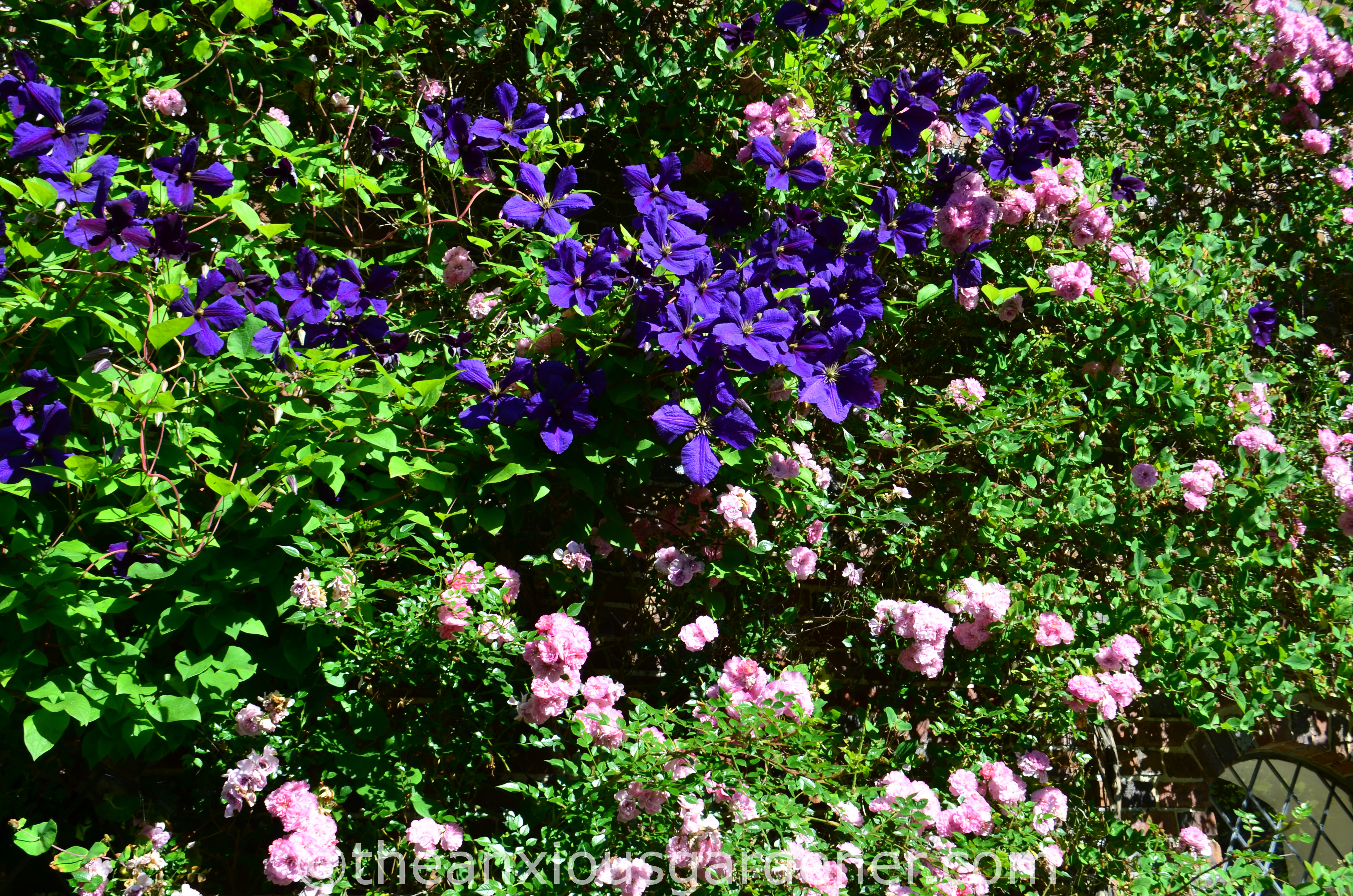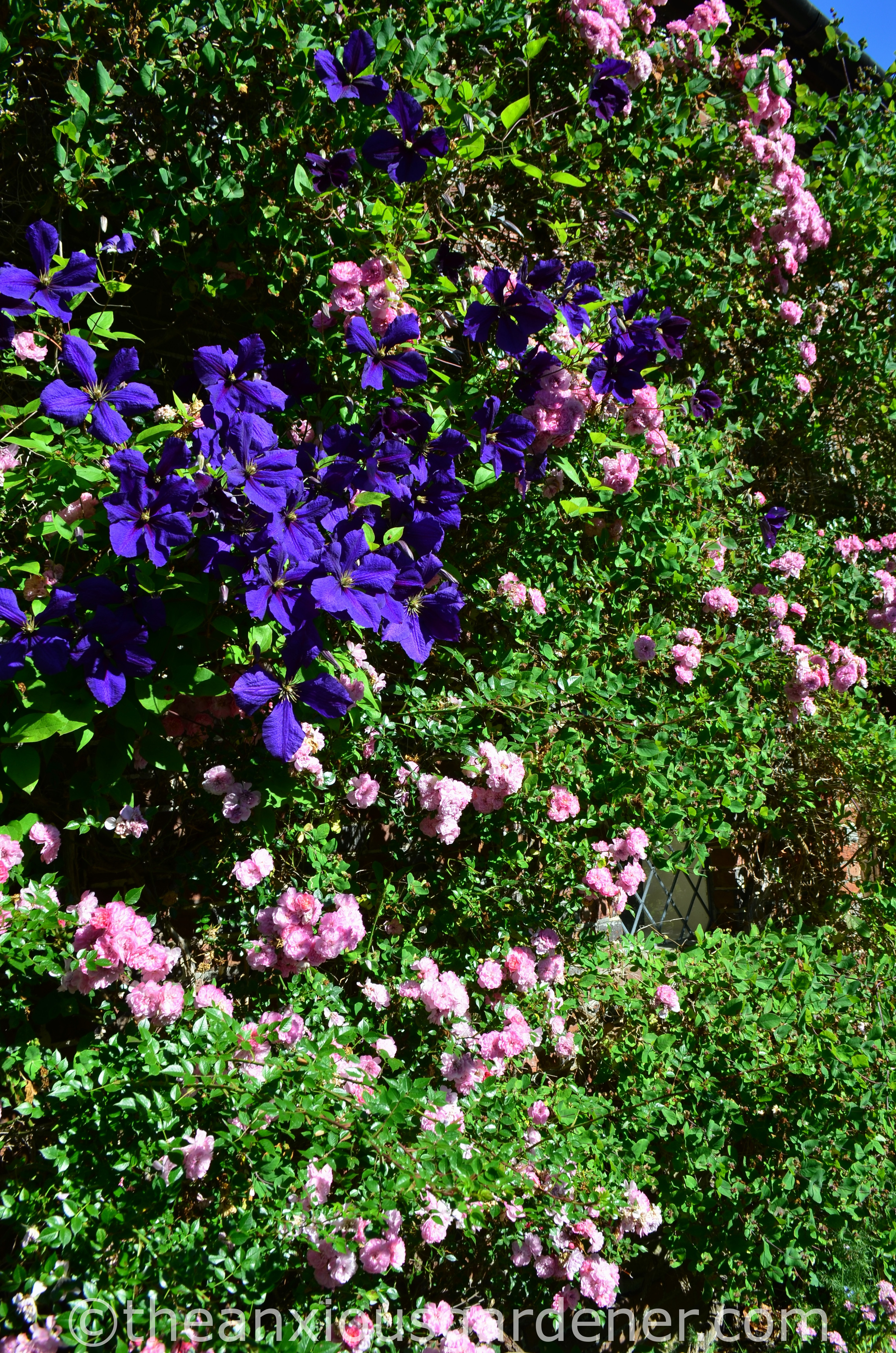 On the east wall of the house is another clematis, Clematis Jackmanii. Growing through a rose (variety unknown), this is the only Priory clematis I didn’t plant.