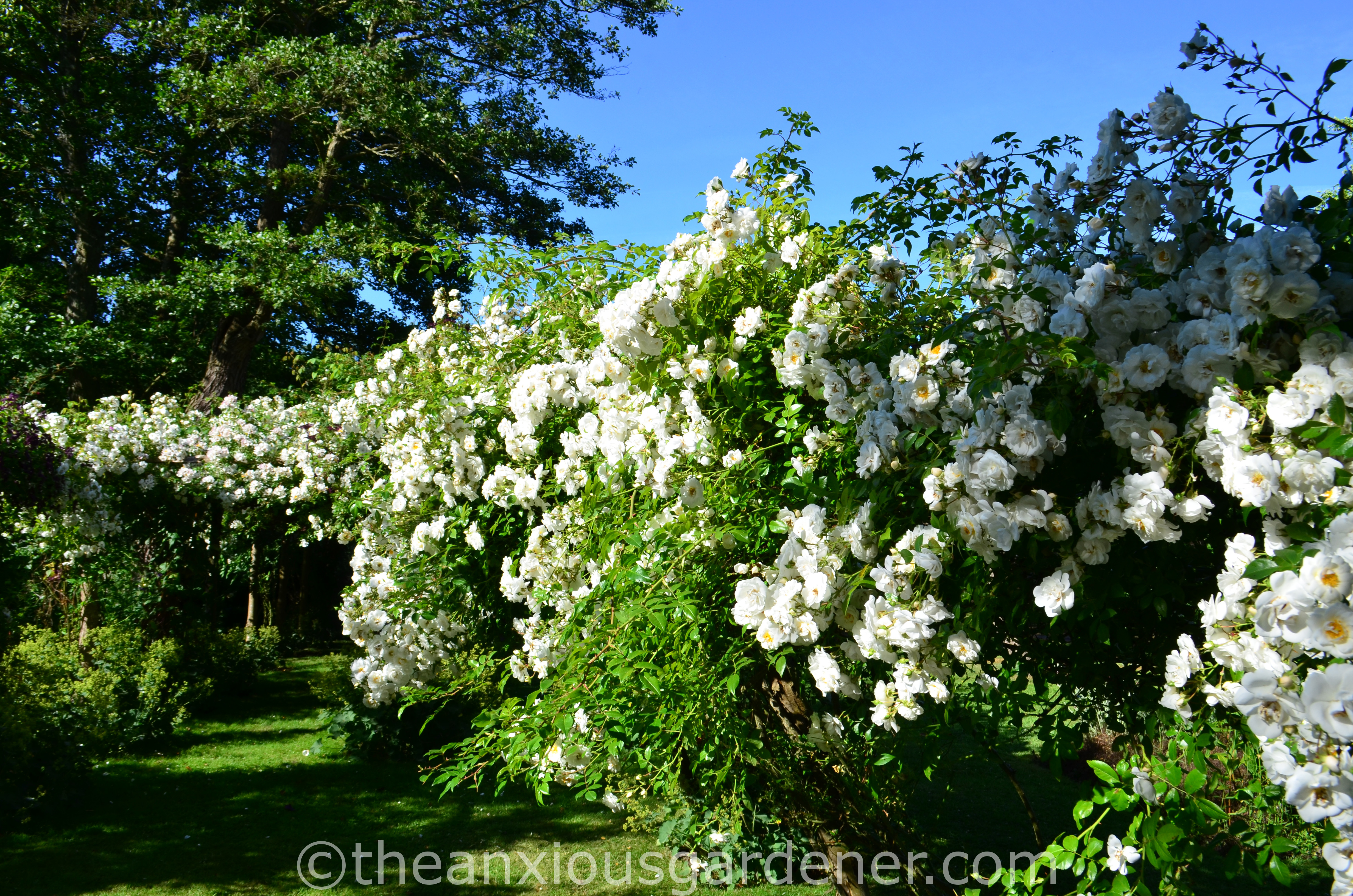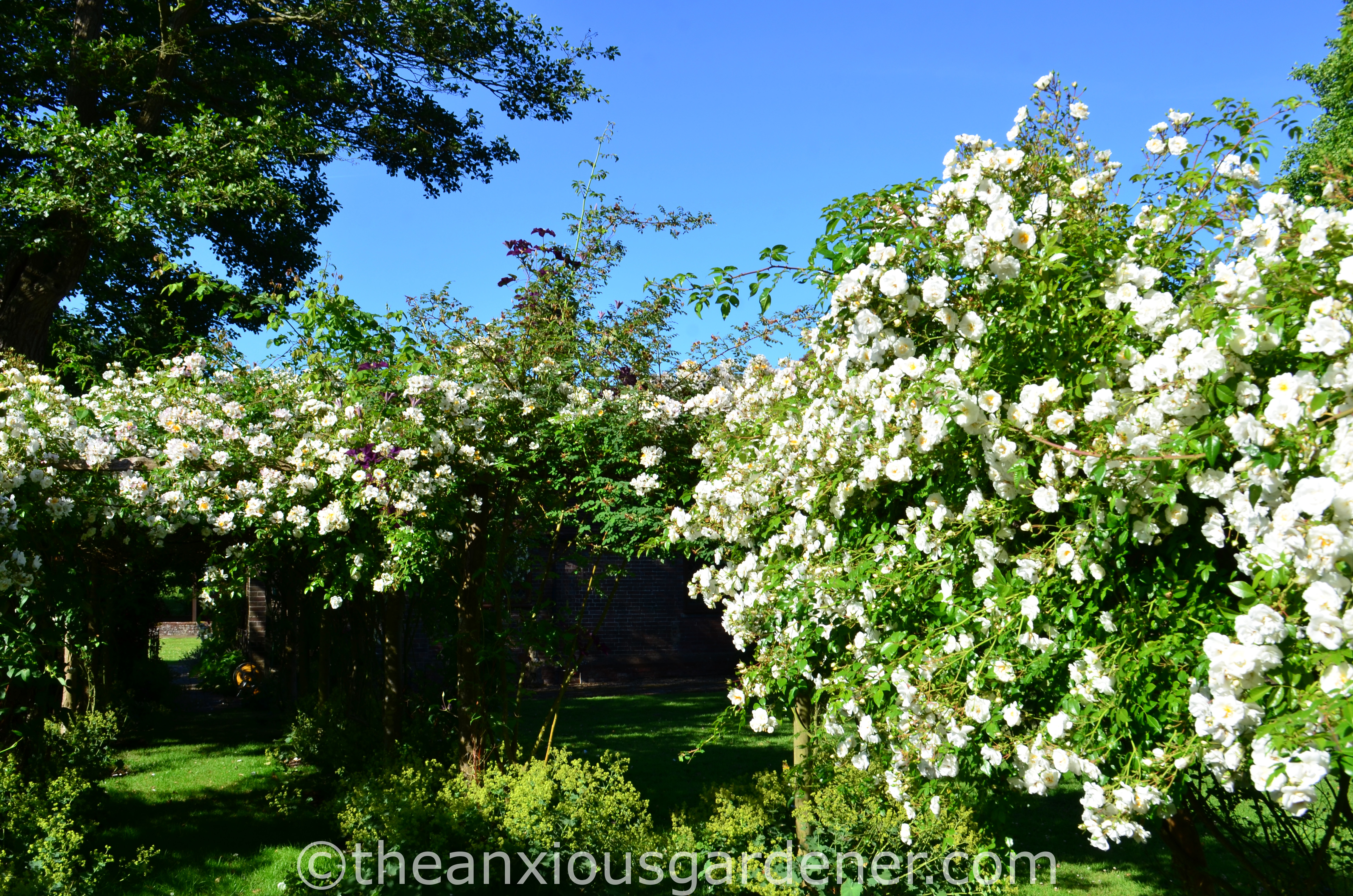 On the rose tunnel, R. ‘Sander’s White‘ is a big fat show off.