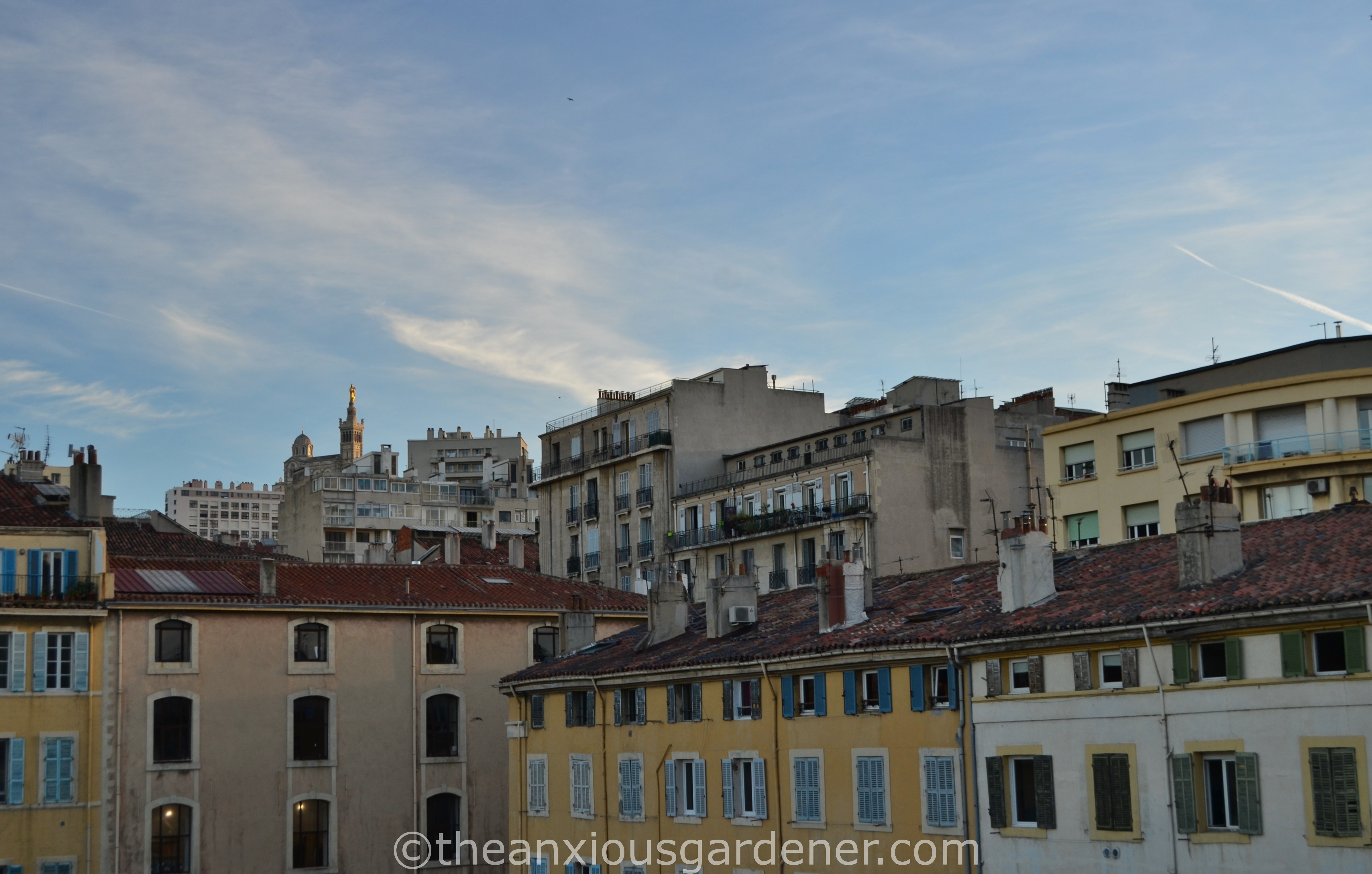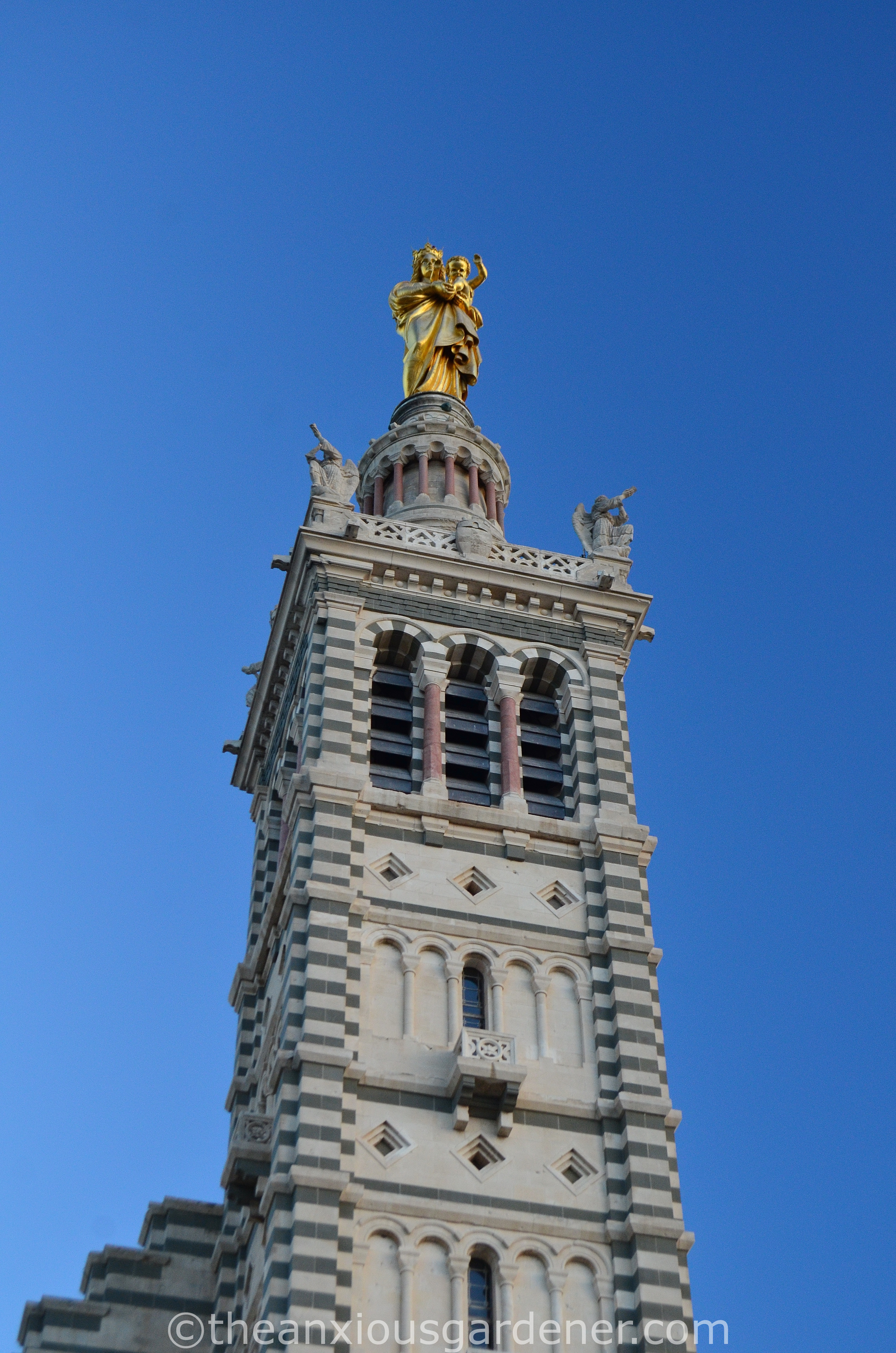 with high up on the skyline, the Basilica of Our Lady of the Guard or, if you rather, la Basilique Notre Dame de la Garde.