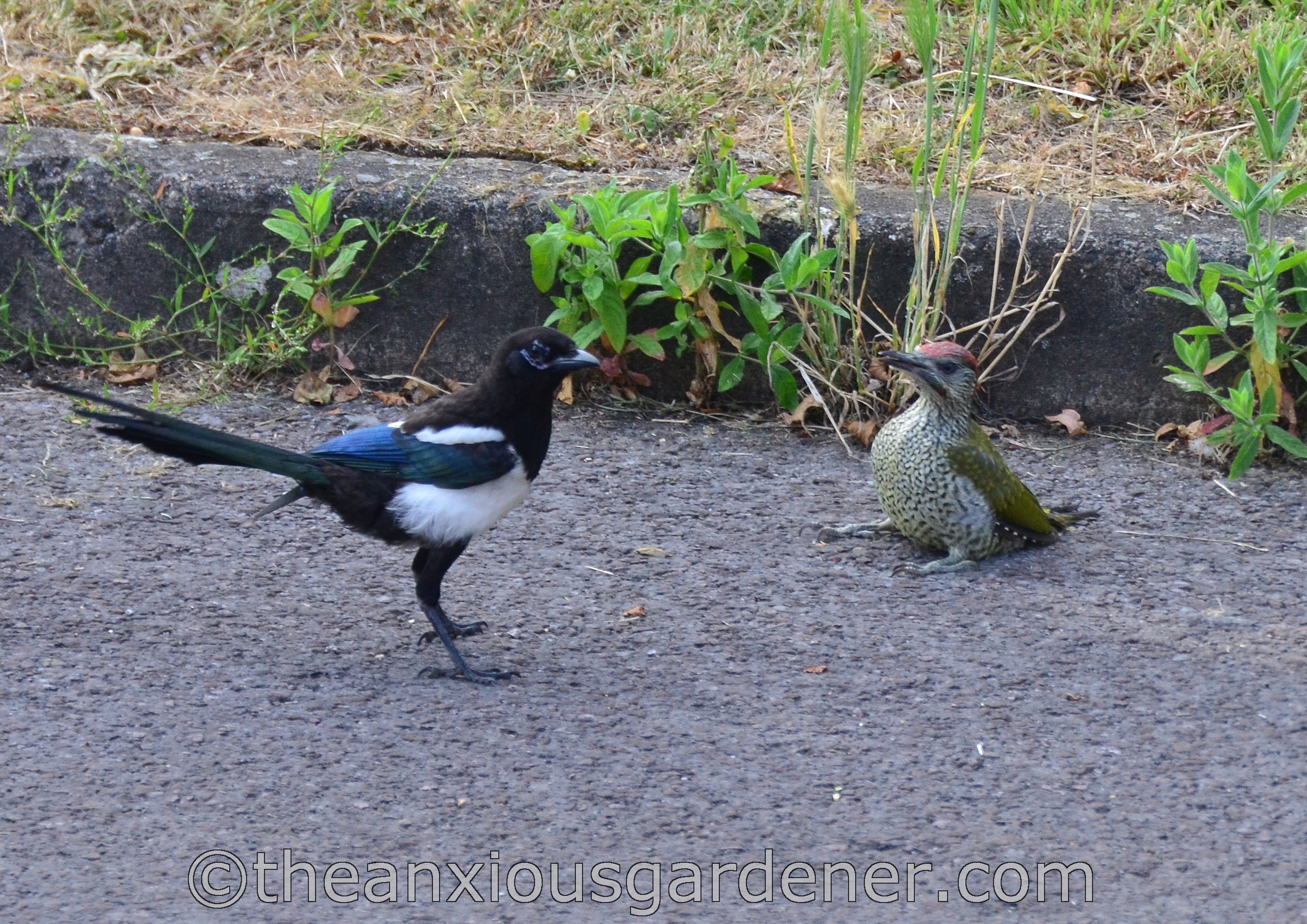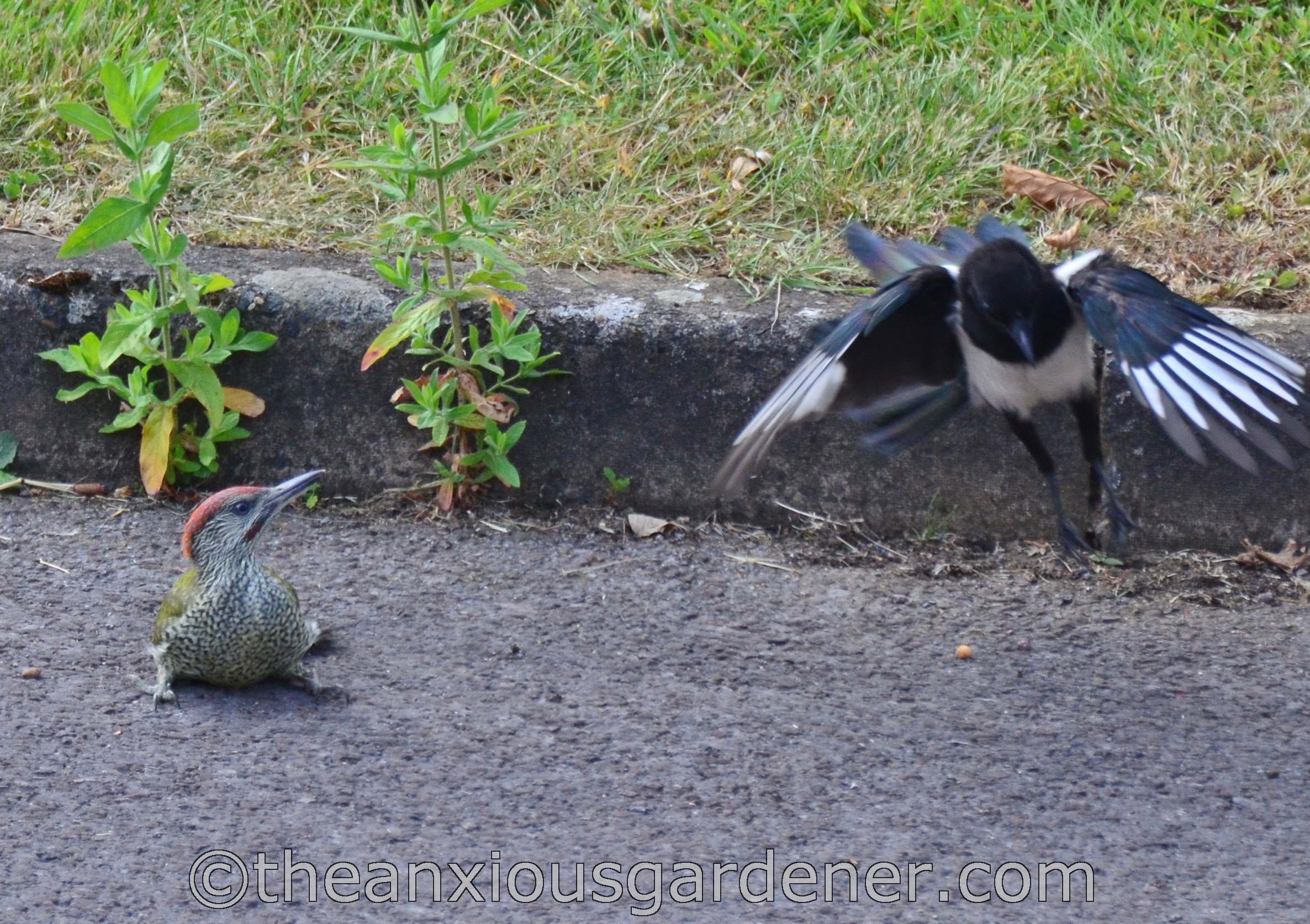 But the woodpecker with her backside stuck to tarmac and her bill at the ready refused to budge. The magpie seemed non-plussed.